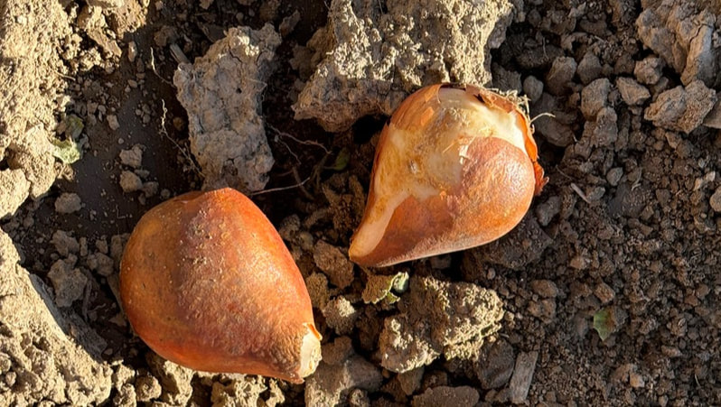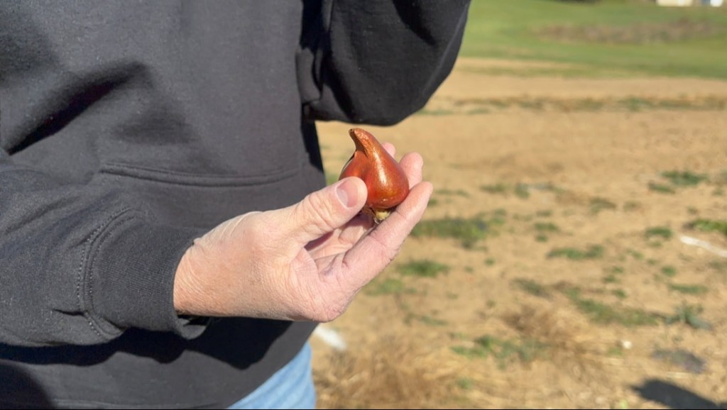 Dustin told me they typically try to purchase tulip bulbs of a specific size to grow well in their soil. These bulbs come in all different colors and resemble onions with their layered skin. They also have a sprout end and a root end.