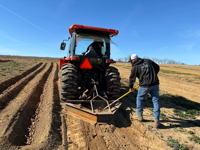 Plowing: Each of the three rows per field is plowed precisely according to the plotting. Once the plot is tilled, the plowing process goes pretty quickly. The plow digs the dirt to allow the bulbs to be planted 6–8 inches deep. Then, it’s time to plant!