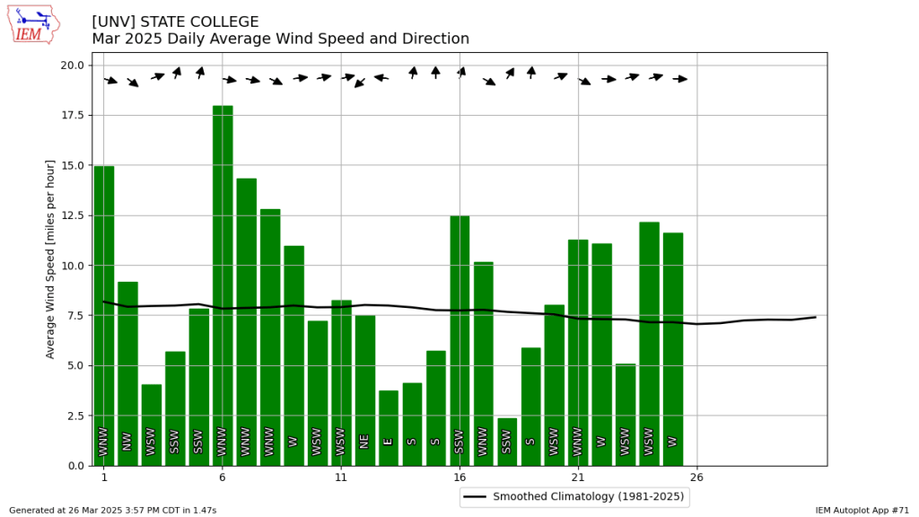 March 2025, our average wind speed was 8.6 mph in State College and 10.7 mph in Altoona, meaning, yes, it has indeed been windier than normal!