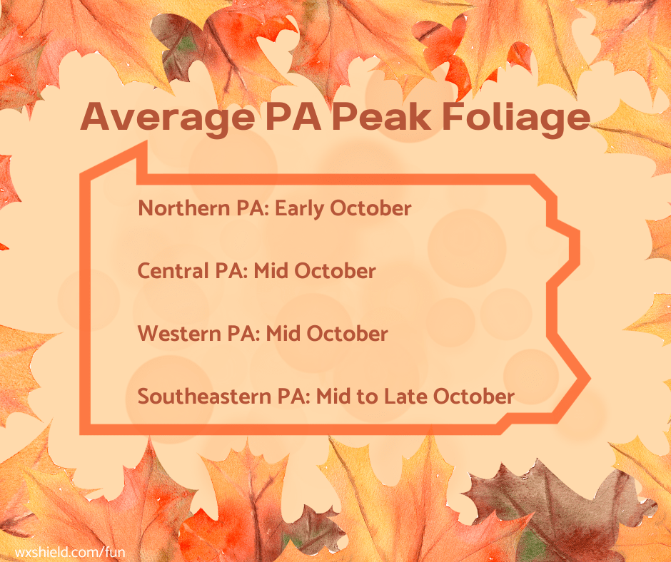 - Northern PA: The earliest peak tends to be in the first few weeks of October.