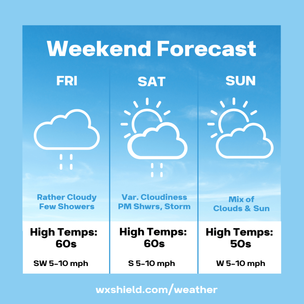 Saturday we will have a variable cloudy sky at first, but a cold front will be arriving. This will bring us some showers and storms by afternoon. High temperatures on Saturday will be in the mid to upper 60s. Winds will be from the south between five to ten mph.