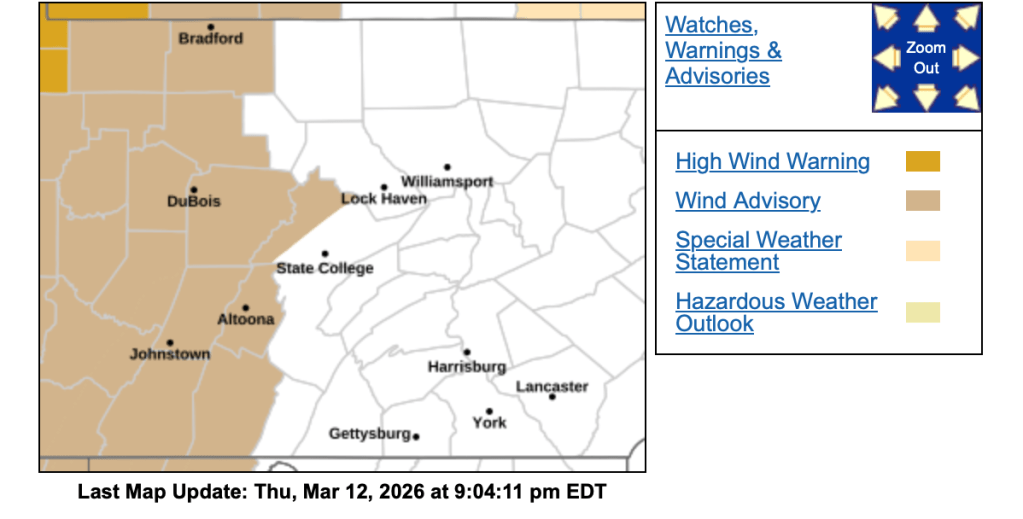 This afternoon it becomes cloudy with a few rain and snow showers mixed in as the clipper system crosses Central PA. Winds will also be picking up form the south between ten to twenty mph. Gusts could be upwards of 40 mph. Due to this, the National Weather Service has issued a Wind Advisory for most of the area from 11 am today until 2 am Saturday morning.