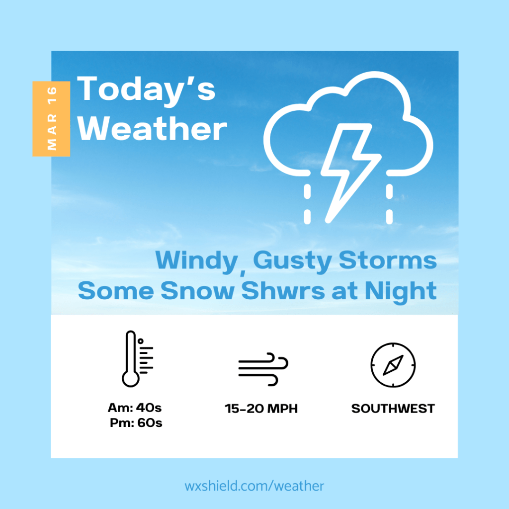 This morning temperatures will be in the mid to upper 40s. Winds this morning will be from the southeast between fifteen to twenty mph. Due to the stronger winds, the National Weather Service continues the Wind Advisory until 11 am. This morning we will be cloudy with some showers.