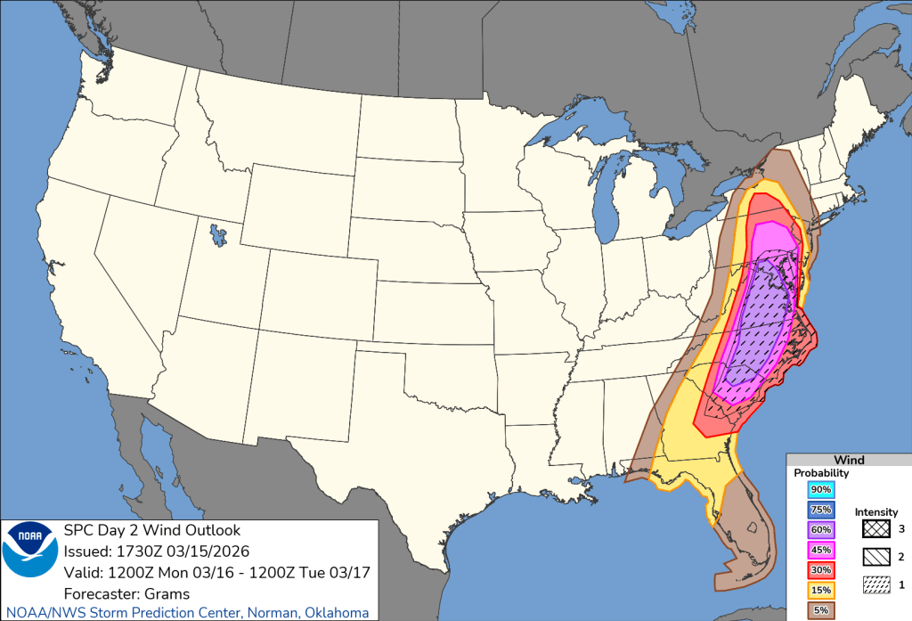 This afternoon a cold front will arrive. Ahead of it, we will see temperatures climbing, and if there is any sunshine, will add instability to the atmosphere. This afternoon with the crossing of the cold front, we could see strong to severe storms with damaging winds. The National Weather Service has put us under a slight risk for severe weather (2 out of 5). Just to our east, it is an enhanced risk. Please stay weather aware. Our biggest threat is damaging winds and even potentially a tornado.