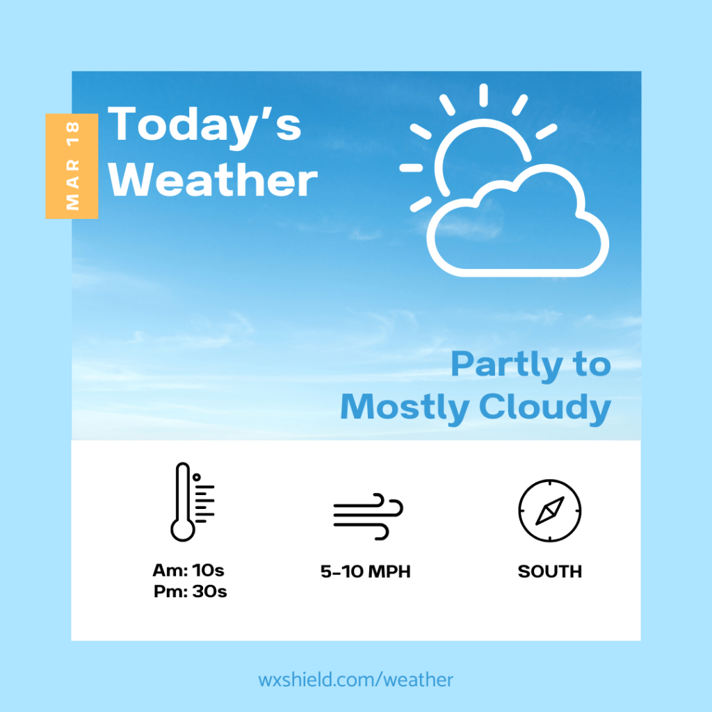 This afternoon we will have a partly to mostly cloudy. Temperatures this afternoon will be in the mid to upper 30s. Winds will be from the south between five to ten mph.