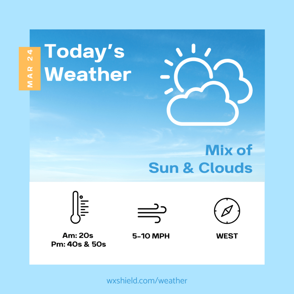 Temperatures this morning will be in the 20s. Winds will be from the northwest between ten to fifteen mph. We will have patchy clouds.