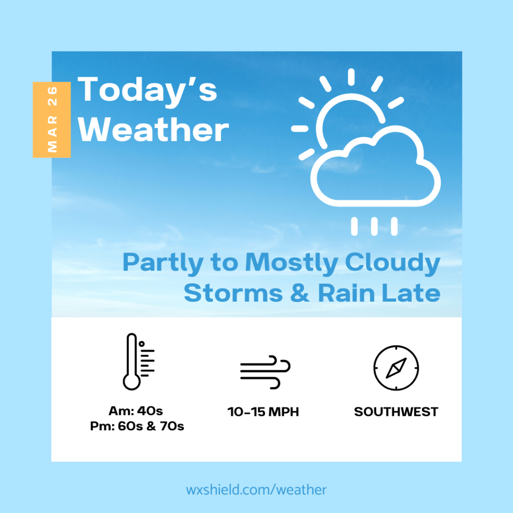 Temperatures this morning will be in the mid 30s. We will have a partly to mostly cloudy sky. There could be a stray sprinkle. Winds will be from the south between five to ten mph.