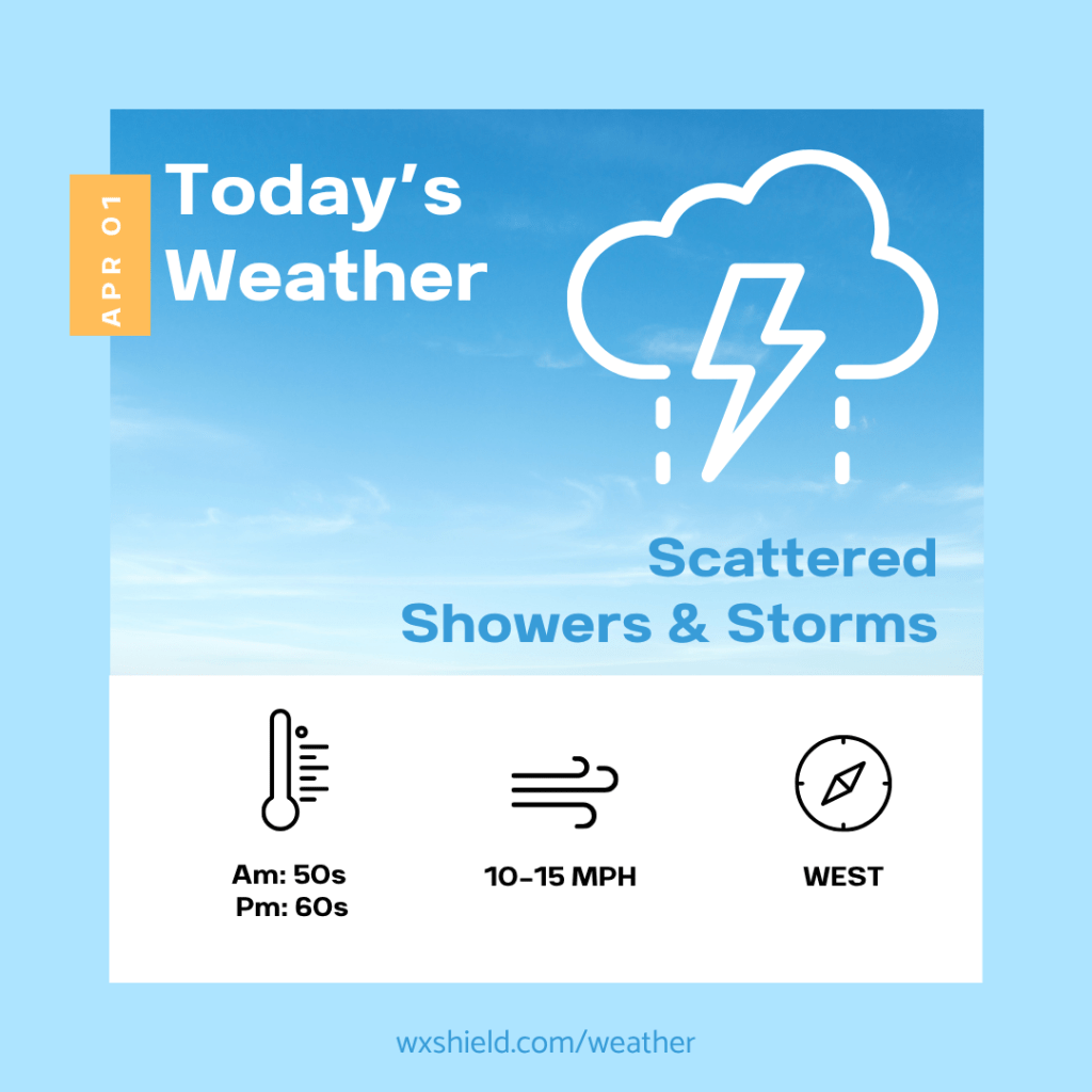 This afternoon we will have scattered showers and storms with a variable cloudy sky. If we see a little sunshine, this could lead to some gusty storms. Temperatures will reach into the upper 60s. Northern counties may be stuck in the 50s. Winds will be from the west between five to ten mph.