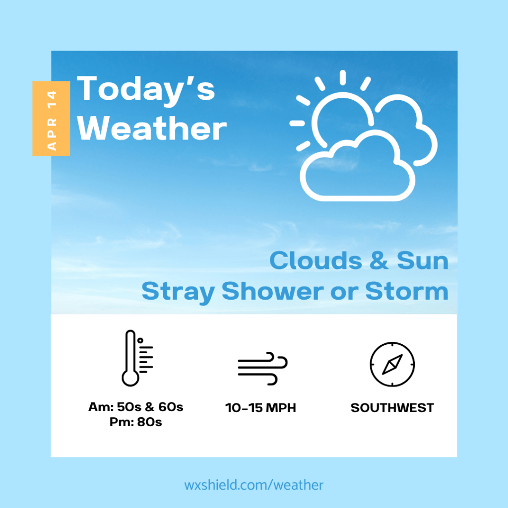 Today temperatures will be in the upper 70s to lower 80s. We will have a mix of clouds and sunshine. A shower or storm cannot be ruled out. Winds will be from the southwest between ten to fifteen mph.
