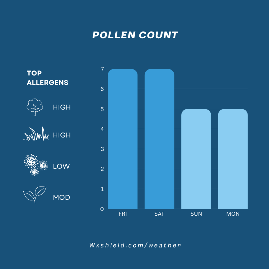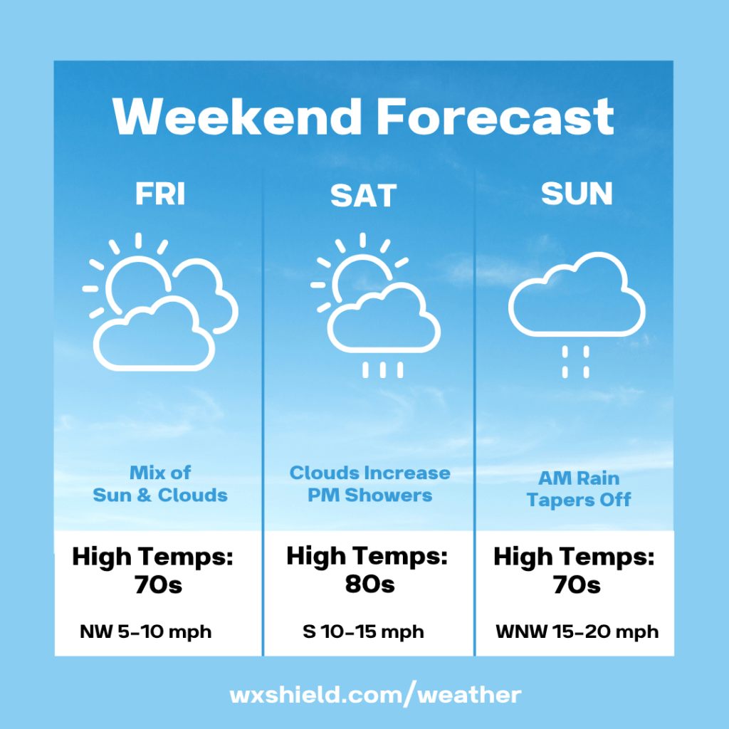 Saturday high temperatures will reach the upper 70s to lower 80s. We will see temperatures climbing again, thanks to a southerly breeze between ten to fifteen mph. A cold front will be approaching on Saturday. Saturday morning we start off with clouds and sun. Clouds will increase throughout the day and showers and a storm will arrive by afternoon and evening.