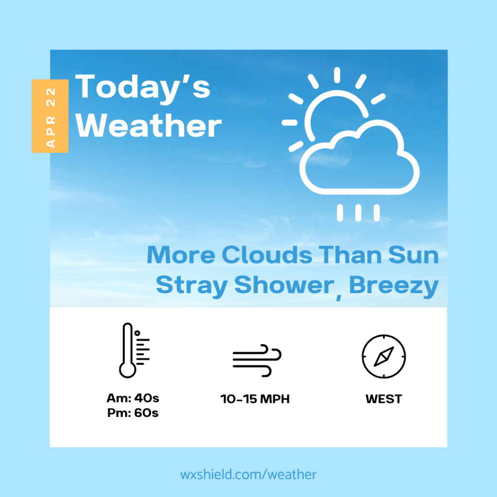 This afternoon there will be more clouds compared to sunshine. A stray shower cannot be ruled out. High temperatures will be in the upper 60s nearing the 70 degree mark. Winds will be from the west between ten to fifteen mph.