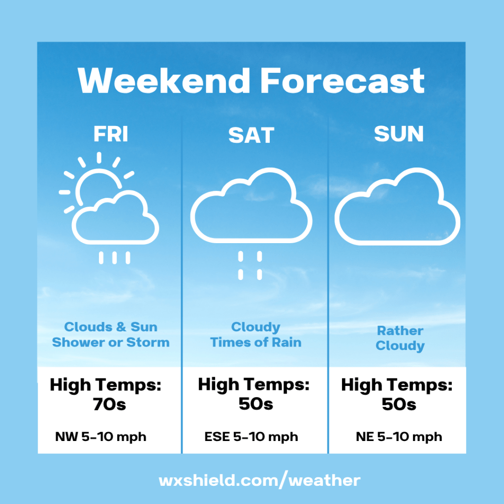 Today we will start the day with clouds and some sunshine. This afternoon there will be a shower or storm that pops up. Temperatures will reach the upper 60s to lower 70s. We will have a northwest wind between five to ten mph.
